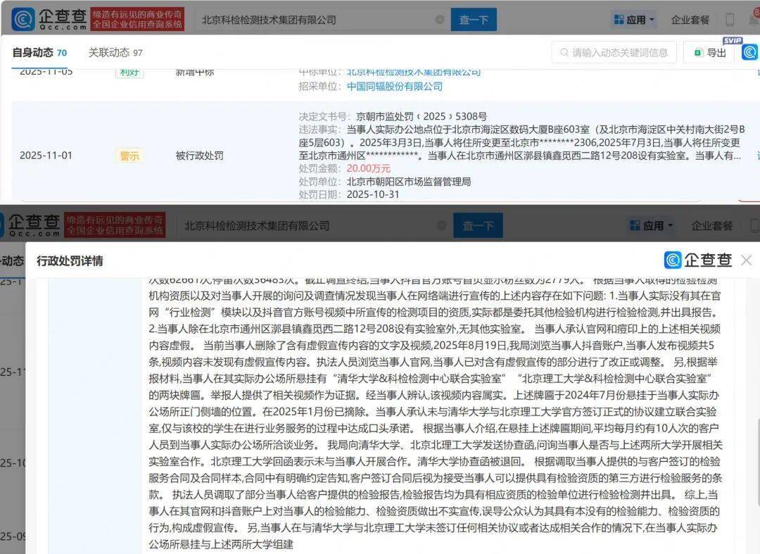 在12月25日相关栏目中,送检的检测机构如下图所示,为K·J科检检测。即北京科检检测技术集团有限公司。