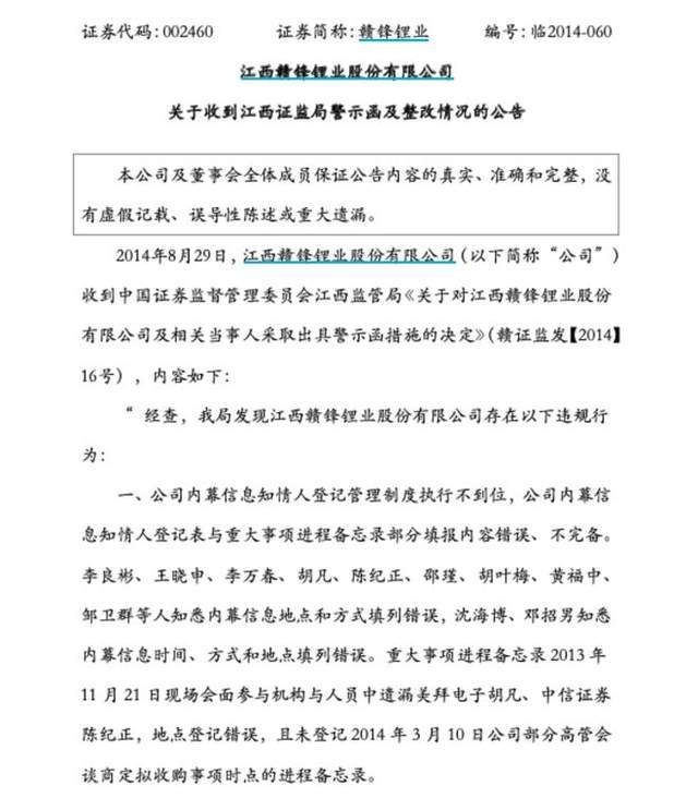 值得注意的是,这家巨头在狂奔扩张中,“合规沉疴”早已有之。例如,2014年,在收购美拜电子时,赣锋锂业就有过涉嫌否认、隐瞒、登记造假的戏码,被监管予以警告。